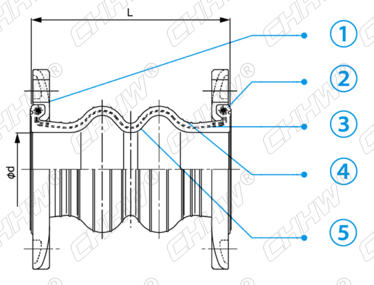 | 5 | 内部材质 Outer Rubber | 天然橡胶(NR)、丁腈橡胶(NBR)、氯丁橡胶(CR)、丁基橡胶(IIR)、氟橡胶(FKM)、三元乙丙橡胶(EPDM) |