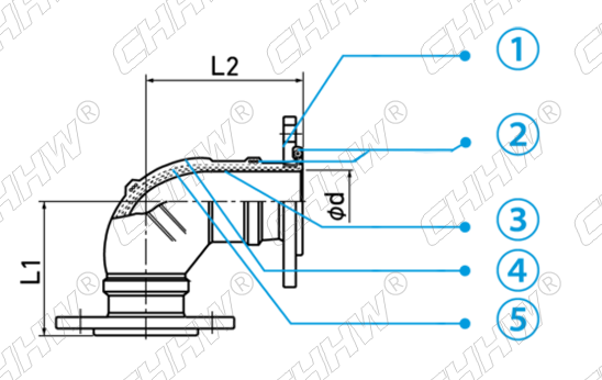 CHHW华威牌新型气吹可曲挠橡胶弯头,简称橡胶弯头,是由织物增强的橡胶件与平形活接头、松套金属法兰或螺纹管法兰组成,用于管道隔振降噪、补偿位移的弯头。